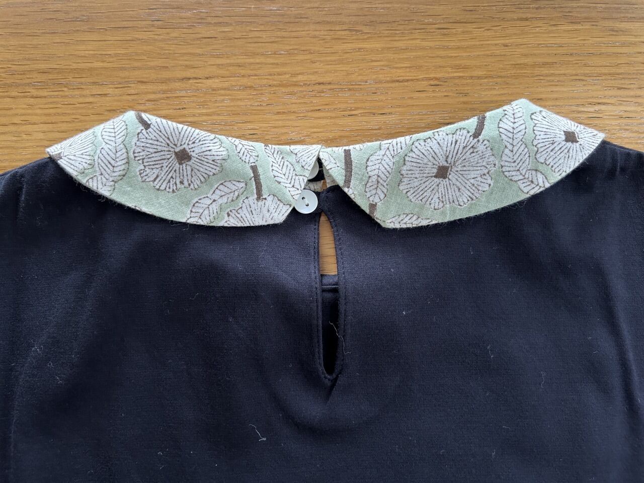 襟元は後ろボタン2つで留めるようになっているので、表は見た目スッキリ、後ろ姿もかわいく仕上がっています。