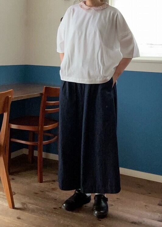 シンプルな形にadmiファブリックで可愛さをプラスした襟付きカットソーは、ワイドシルエットと長めの半袖で体型カバーもしてくれます。