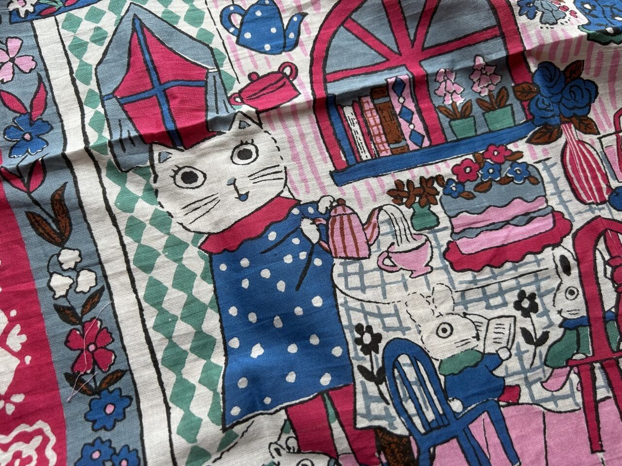 イラストレーター・北岸由美さんの描くシロネコとドールハウス、たくさんのお花の柄がとてもかわいらしく、壁や窓に絵のように掛けたくなります。