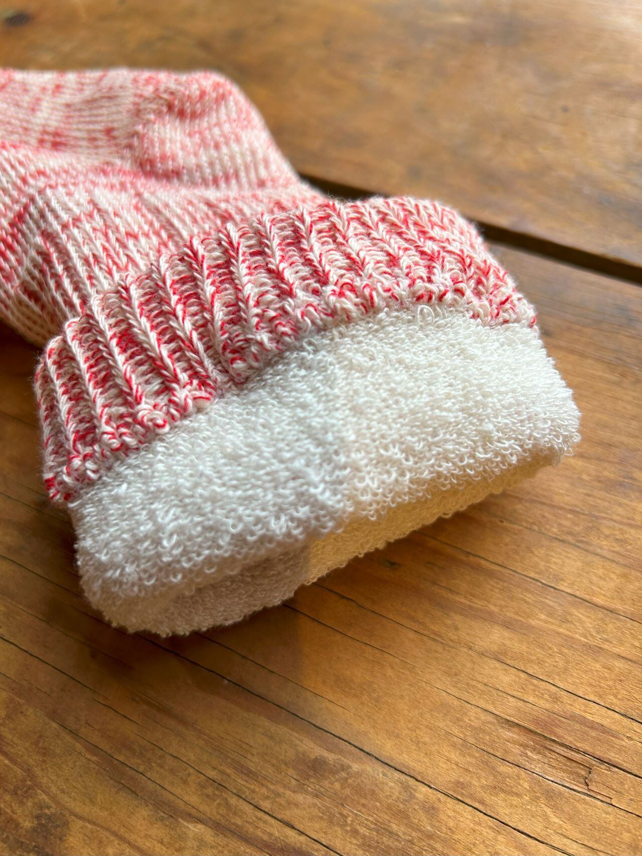 冬のお家時間に欠かせない、裏がシルクパイルになっている二重編みの靴下です。